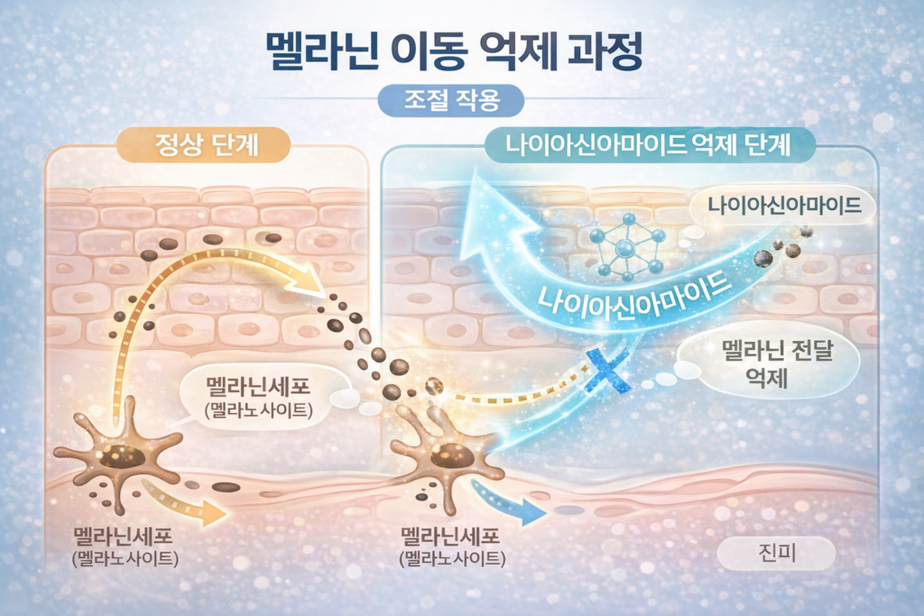 나이아신아마이드는 화장품법 기준 미백 기능성 성분으로 멜라닌 이동 억제 기전을 통해 피부 톤 케어에 관여하는 활성 원료입니다