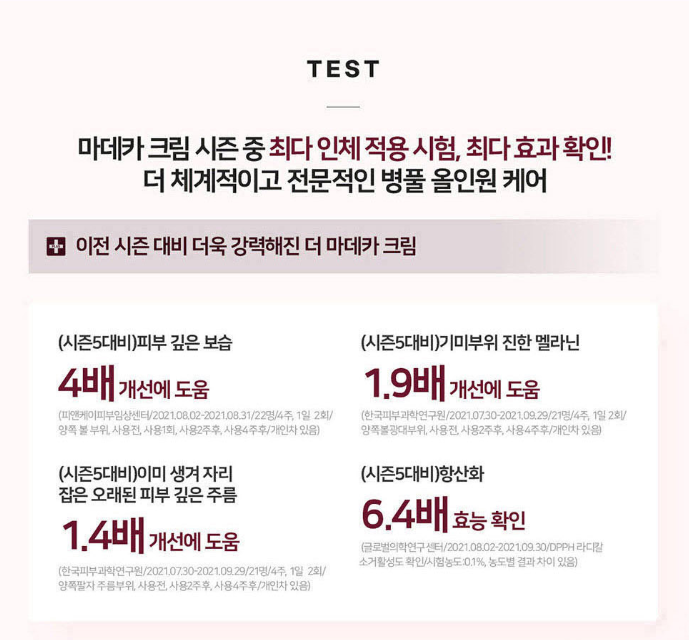 이외 더 마데카 크림은 상세페이지 기준으로 콜라겐, 히알루론산, 엘라스틴 등 피부 구성과 연관된 주요 요소와 피부 톤, 탄력, 모공, 주름 등 여러 피부 지표를 중심으로 인체 적용시험이 진행된 제품으로 안내되어 있습니다.