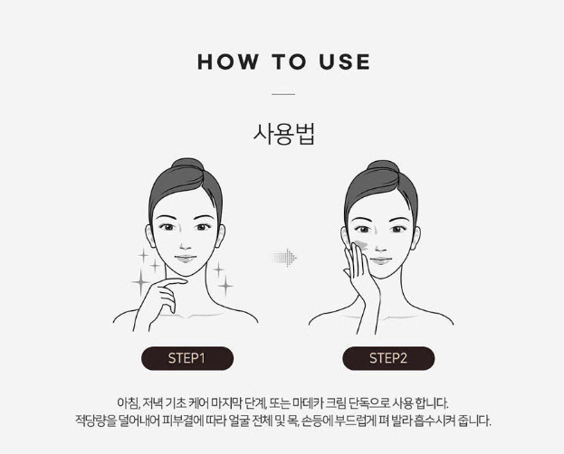 사용 방법은 스킨케어 마지막 단계에서 적당량을 덜어 얼굴 전체에 부드럽게 펴 바르는 방식으로 안내되어 있습니다.