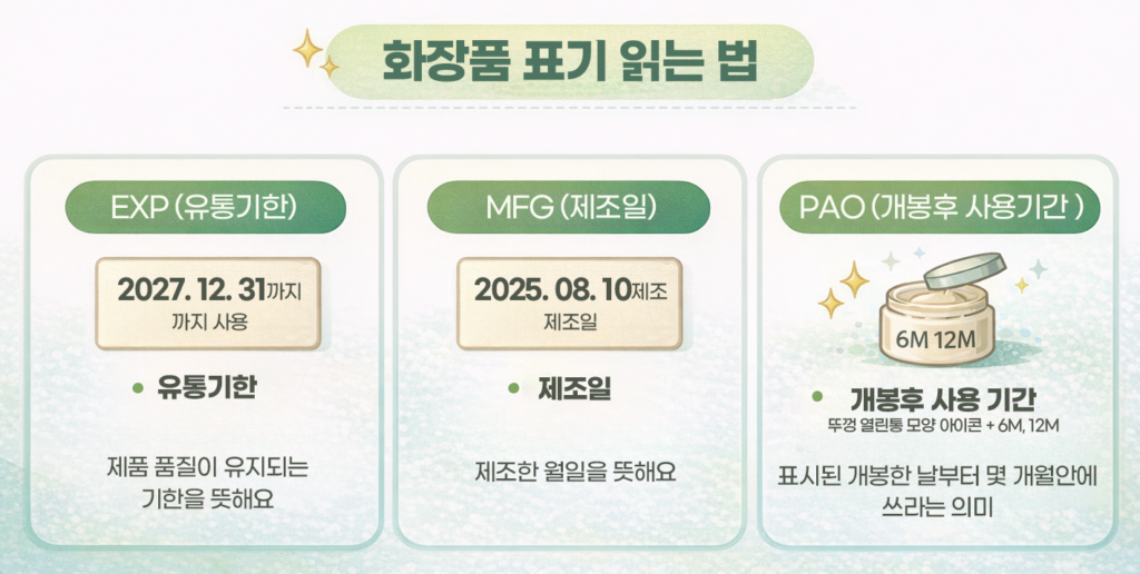 화장품 사용기한은 유통기한만 보는 게 아니라 개봉 후 사용기간 PAO와 보관 환경을 함께 보는 게 핵심입니다