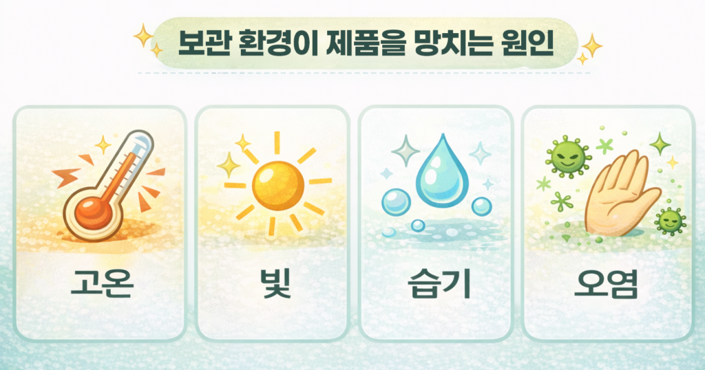 특히 온도 습도 빛 공기 오염이 겹치면 효능이 떨어지거나 냄새 색 제형이 바뀌고 민감 피부는 트러블 자극으로 이어질 수 있습니다